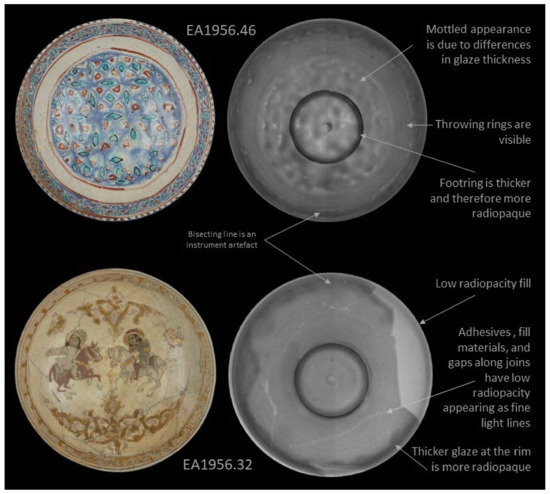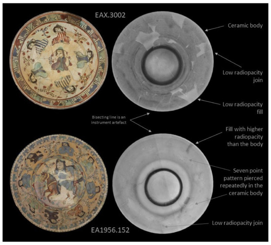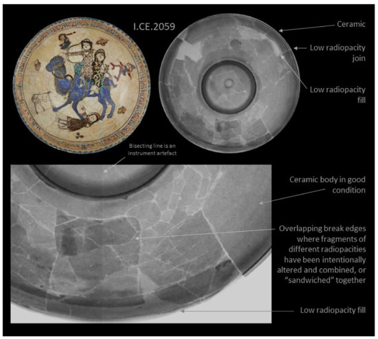 6]. Joins, which are low density voids, and fills are clearly visible in these images because fill materials have a different radiopacity than the ceramic. Radiography of these artworks indicated that some have ceramic material from other objects incorporated into them, a phenomenon which is not unheard of in Islamic ceramics [