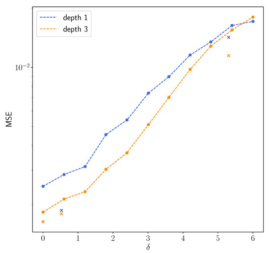 Semilogarithmic plot of the mean squared errors of the NETT using and depending on the noise level. The crosses are the values for the phantoms in Figure 2.
