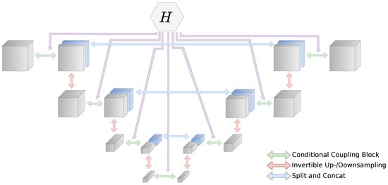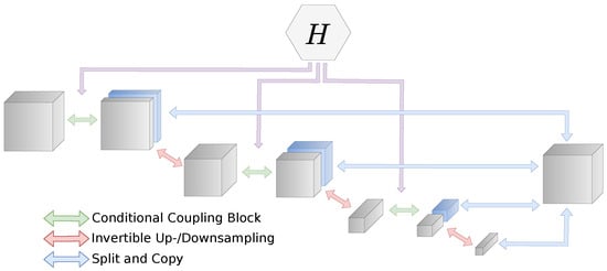 The multi-scale architecture follows the NICE and Real-NVP framework [,] and is related to the i-RevNet architecture []. However, in i-RevNet, the authors refrained from splitting the dimensions in their bijective architecture.