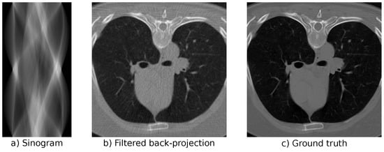 For continuous, noise-free measurements, the filtered back-projection (FBP) in combination with the Ram-Lak filter gives the exact inversion formula []. In general, recovering the image is a mildly ill-posed problem in the sense of Nashed [,]. This means that slight deviations in the measurement, e.g., noise, can lead to significant changes in the reconstruction. The influence of the noise can be reduced by choosing an adequate filter for the FBP. Another challenge arises from the discretization of real measurements, which can lead to artifacts in the FBP reconstruction. Over the years, a number of different reconstruction methods, such as algebraic reconstruction techniques [] (ART) and total variation (TV) regularization [], were introduced to compensate for the drawbacks of the FBP. Recently, deep learning approaches extended the choice of methods to push the boundaries on image quality for low-dose, sparse-angle, and limited-angle measurements [,,,].