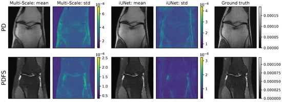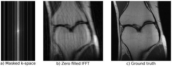In our experiments, we used the emulated single-coil measurements from the NYU fastMRI database [,]. The fully sampled measurements were retrospectively subsampled to simulate accelerated MRI data. See Figure 5 for an example of a subsampled measurement, a zero-filled IFFT reconstruction, and the ground truth obtained from the full measurement. We used an acceleration factor of 4, i.e., only  of frequencies were kept. Undersampling was performed by selecting  of the lowest frequencies and randomly adding higher frequencies until the acceleration factor was reached. The public dataset consists of a training part and a validation part. In total, the training dataset includes 973 volumes (34,742 slices) and the validation dataset includes 199 volumes (7135 slices). Additionally, there is a private test set that consists of 108 volumes (3903 slices). For this private test set, only the undersampled measurements are available, and the models can only be evaluated on the official fastMRI website (https://fastmri.org/, last accessed: 16 November 2021). Our best model can be found on the public leaderboard for “Single-Coil Knee”, allowing for comparison with other approaches (our submission is named “cINN v2”). The fastMRI dataset includes scans from two different pulse sequences: coronal proton-density weighting with (PDFS) and without (PD) fat suppression. We trained our models on the full dataset, but used the distinction into PD and PDFS for evaluation on the validation set.