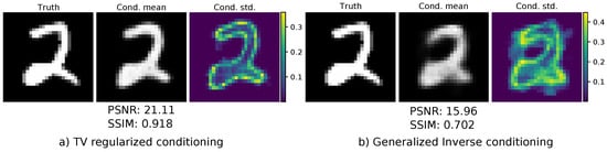 Both models were trained using the Adam optimizer [] until convergence with a fixed learning rate of 1 × 10−4. The final model was chosen as the best model regarding the negative log-likelihood on the validation set. The conditional mean was used as reconstruction, and we evaluated both the PSNR and SSIM for the entire test set. The results can be seen in Table 1. The TV-regularized solution as the conditioning input leads to a drastic improvement both in terms of PSNR and SSIM. A visual comparison of one reconstruction is given in Figure 6. One can see that the reconstruction using the TV-regularized solution fits way better to the original ground-truth image. In addition, the conditioned standard deviation is more centered towards the edges of the number. The reconstruction using the generalized inverse as a conditioning input is much smoother and more blurry. The conditional standard deviation is not so focused on specific features on the image. Lastly, we illustrated samples from both models in Figure 7. The samples drawn from the model using the TV-regularized conditioning input look much more realistic.