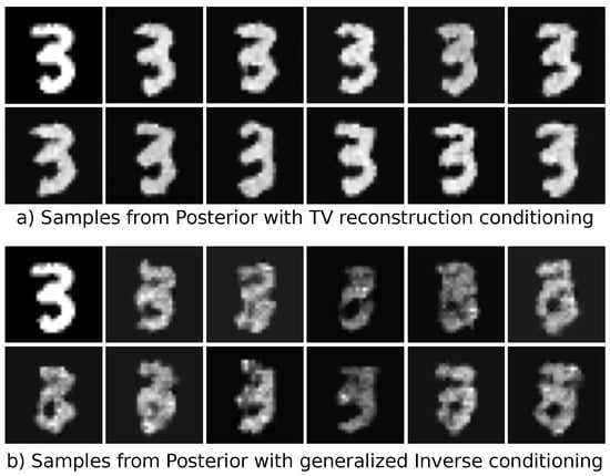 Inverse problems can be studied from a statistical point of view []. In this interpretation, we are interested in the conditional distribution  of the unknown image x given the measurement data , the so-called posterior. Using Bayes’ theorem, this posterior can be decomposed into a prior  and the likelihood :