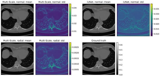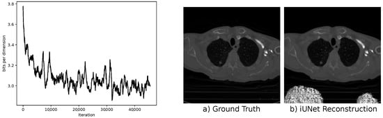 A variety of neural network methods have been proposed to analyze inverse problems []. We are especially interested in methods that can estimate the uncertainties arising in the inversion process. Several approaches have been developed in the past, e.g., Bayesian neural networks can be combined with deep learning models [], or conditional GANs can be used to learn the unknown posterior density implicitly []. Recently, flow-based models have been used to learn a surrogate model for the unknown posterior. These flow-based models are often implemented using invertible neural networks. They have been used to predict oxygen saturation in tumors [], image colorization [], day-to-night translation [], reconstruction of the grazing incidence in X-ray fluorescence [], or the identification of the permeability field of an oil reservoir []. There is also the first application for computed tomography [,]. Recent work also studied the application of stochastic normalizing flows to inverse problems []. Our work builds on the concept of conditional invertible neural networks (cINNs) as introduced in [], but our focus lies on medical image reconstruction.