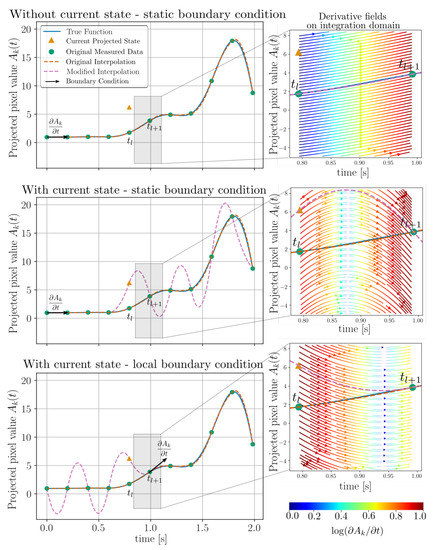 - Re-interpolation using original data with the exception of replacing the current data point at with the current projected state of . The boundary condition for interpolation is again applied statically (regardless of ) at as in Equation (32).