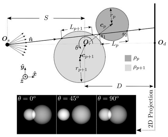 Top down 2D schematic of ray sphere intersection considering a point like X-ray source at and two illuminated spheres with centroids at and .