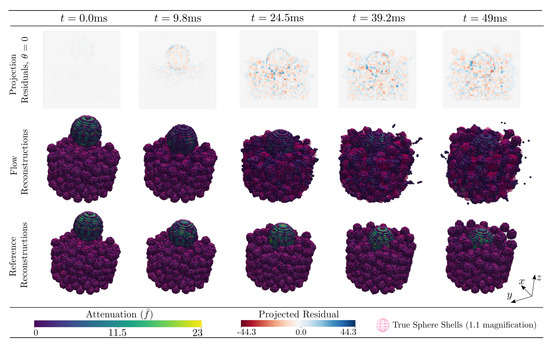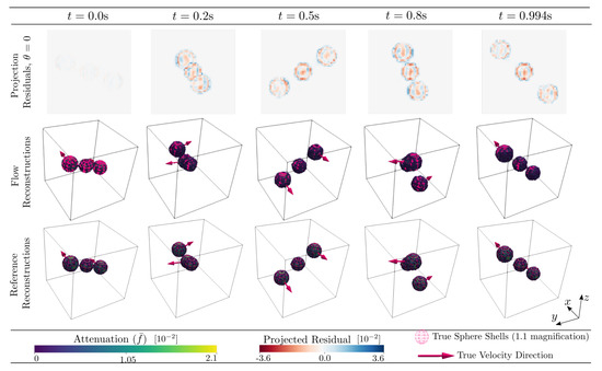 The projection residuals in the top row of Figure 5 display an initial, close-to-zero error followed by a rapid evolution and (possibly) stabilisation, with typical values of about two times that of the sphere attenuation. As the constitutive spheres have a diameter of several voxels/cells (>10) this represents a relative projected error much less than unity. The error magnitudes can be assessed further by Figure 7, where it is seen in the left histogram that the final MAE and RMSE in the real space reconstructions are far lower than the interior sphere values (peak in the histogram). This is also reflected in the 3D renderings of Figure 5, where the reconstructed thresholded volume fits well to the overlaid true particle positions and is visually very close to the reference reconstructions. The initial close-to-zero projected residual (as opposed to a zero residual) present at is due to analytical and numerical ray model discrepancy. In a best-case scenario, Algorithm 1 would propagate in time without introducing any additional errors other than those that are inherent in the ray model. In Figure 6, an error build up to a few times this inherent error is, however, observed. Interestingly, this error build up seems to stabilise after about 100 timesteps. One might be tempted to think that this error cannot be attributed to a poor spatial velocity basis representation, as the same phenomenon can be observed in Figure 3 where the motion is uniform in and, thus, perfectly represented by the finite basis expansion. One should however remember that, although the true underlying attenuation function may feature a velocity field that is uniform, the velocities needed to optimally update the discretised version of f may very well not be uniform. It is, therefore, likely that the discrepancy between true and discretised attenuation field, together with a finite basis expansion of the velocities, is driving the observed error. This would also explain why the error plateaus after some initial iterations, as then the best possible dynamic sphere representation allowed by the velocity expansion and continuity requirement has been reached. This inherent error would then indeed be expected to be higher than that of the best possible static sphere representation allowed by a classical tomographic reconstruction, where each individual cell value may be changed arbitrarily and independently of neighbouring cells.