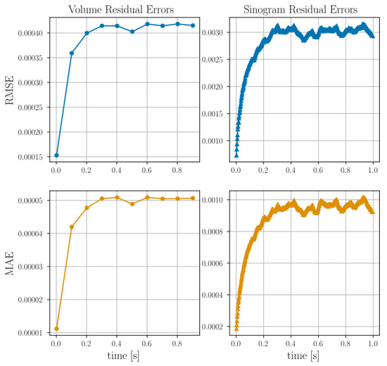 reaching a prescribed maximum at . Using simulated projections from 5 separate angles (described in detail in Section 8 and Section 9) we may define a simulated data time series. Reconstruction from these projection data is illustrated in Figure 3 where the root mean squared error of both volume () as well as projections () are shown as functions of time. By acquiring full simulated reference scans at multiple selected time points and performing, from these, classical tomographic reconstructions, the volume residuals can be analysed. To provide some comparative value to the RMSE, we present, in Figure 3, also histograms over the volume and sinogram values clipped at 1% of their maximum values.