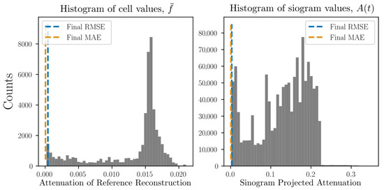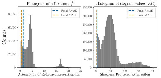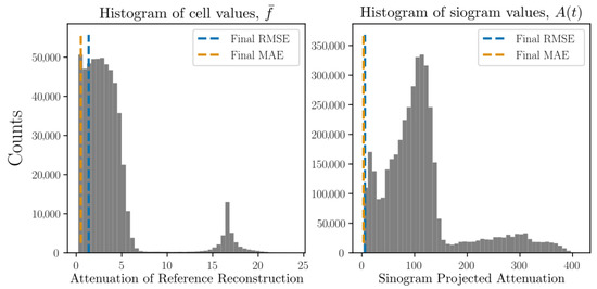 To put the RMSE and MAE in relation to the imaged system, histograms over the phantom attenuation and projection values, analogue to those shown in Figure 7, are presented in Figure 13.