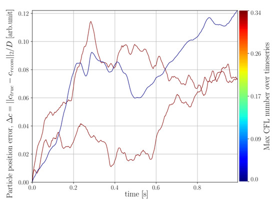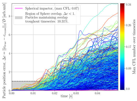 Finally, for the DEM simulation featuring large grains, the result of velocity tracking is presented in Figure 14. The particle position error of the impactor has been marked in an off-coloured cerise, as opposed to the errors of the particle ensemble, which have been coloured by their corresponding maximum CFL found throughout the time-series. At the final timestep, it was found that 86.71% of the predicted particle positions still maintained overlap with their corresponding true positions. We remind the reader that a particle position error >1 means that the predicted and true position of a sphere has a zero overlap. From the colouring of the error curves, it is seen that particles with higher maximum CFL numbers tend to also produce higher particle position errors.