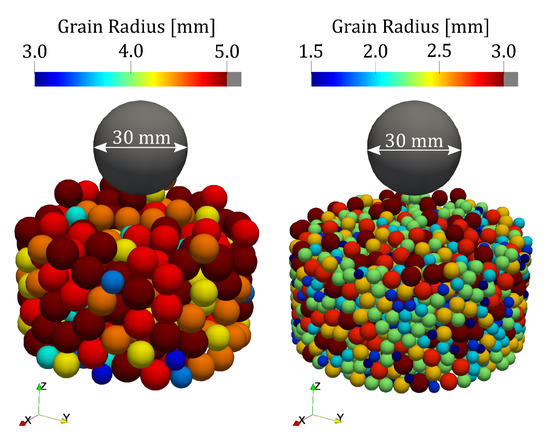 Two DEM simulations were run featuring a total of 300 and 2200 particles, respectively. The radius-size distribution and initial geometry of the two simulations are depicted in Figure 9. The simulations featured the impact of a dense, large, spherical, gravity-driven impactor on a grain ensemble confined by a cylindrical tube. The LIGGGHTS input files, specifying the input parameters of the simulation, are provided in the Supplementary Materials.