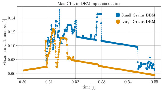 The maximum CFL number found for any sphere in the DEM simulation at each integration timepoint is depicted in Figure 10. It can be seen that the small-grains DEM features, in general, grains with higher velocities than the large-grains DEM and that it is feasible to reconstruct the motion of either system, as the CFL number is always less than unity for any grain at any time.