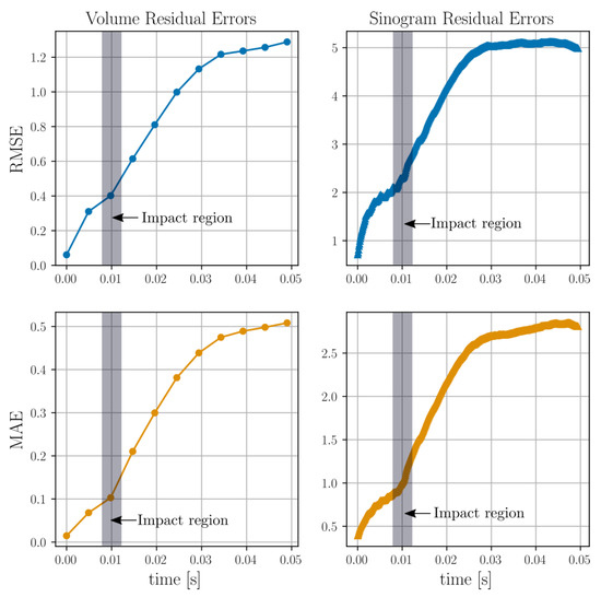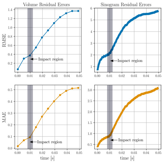 The time evolutions of the RMSE and MAE, as defined in Equations (42) and (43), are presented in Figure 12. The moment the impact makes contact with the granular bed, instantiating motion therein, is marked in grey in the four subplots.