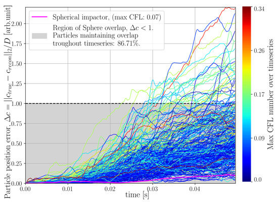 Distance error between true () and predicted () sphere centroids normalised by sphere diameter (D) for the DEM simulation depicted in Figure 11. Each line in the plot represents the error of a single sphere and has been colored by its corresponding maximum CFL number recorded at any instance in the time series. The spherical impactor has been marked by an off-range color (magenta) for visibility.