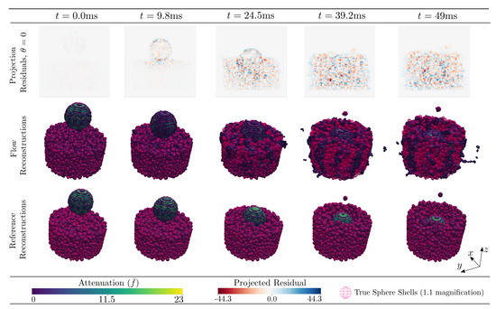 Reconstructed per cell average 3D attenuation, , and projected residuals for DEM phantom featuring impact upon a granular bed. The bottom row illustrates the reference reconstructions from a full set of projections. The middle row illustrates the reconstruction from 5 projections using Algorithm 1. The top row shows the projection residual at which corresponds to projecting along the x-axis into the y-z-plane. The 3D volume reconstructions are rendered by a fixed cut-off threshold (5% of maximum cell value) and shown for varying time as indicated by the legends. The reconstructions are overlayed with their corresponding input particle sphere shells with a 1.1 magnification for visibility. Input parameters are described in Section 9.