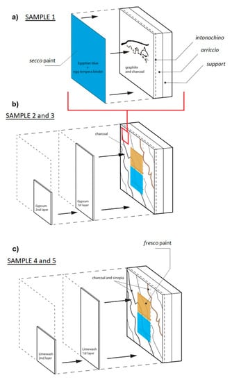 Stratigraphy scheme of the wall painting mock-ups: (a) Sample 1, containing underdrawings hidden under Egyptian blue secco paint layer; (b) Sample 2, which contains underdrawings, covered by 1 and 2 gypsum coats, and Sample 3, which contains underdrawings, covered by fresco and by 1 gypsum coat. (c) Sample 4, which contains underdrawings, covered by 1 and 2 limewash coats, and Sample 5, which contains underdrawings, covered by fresco and 1 limewash coat.
