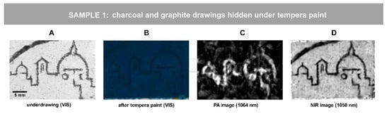 A graphite drawing representing a city skyline as well as the charcoal line (Figure 2A) were hidden under a 70-micron thick Egyptian blue paint layer, applied with egg tempera binder (Figure 2B). The raw PA and NIR images were processed in equal way by the means of ImageJ, applying 1.0% contrast stretching. The PA image (Figure 2C) of the painted sample, obtained in reflection mode, clearly reveals the sketch drawing made by graphite pencil directly on the dried mortar. Both graphite and charcoal traits are revealed in the NIR reflectogram (Figure 2D). However, graphite has a significantly higher absorption than charcoal at 1064 nm [29,41,42]. Since the image contrast in PA image is relative per scanned area, the charcoal line presents in this specific case a too low contrast to be visible in the PA image. For revealing low contrast details in a PA image, application of post-processing algorithms or additional area scans might be needed. These tests lie beyond the aims of the first experimentation and are expected to be addressed by future studies.