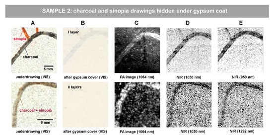 Visible images of Sample 2 are shown in Figure 3 along with the relevant representative results. In top raw, sinopia and charcoal traits on substrate (Figure 3A) are hidden by a 80-micron thick gypsum layer (Figure 3B); in bottom raw, mixture of sinopia and charcoal is covered by 190-micron thick gypsum layers (Figure 3B). Both PA and NIR images were processed in an equal way by the means of ImageJ. The function of 1.0% contrast stretching and 0.6 gamma correction were applied to the PA and NIR images in the top raw and 1.0% contrast stretching with a min value of 10.826 to the PA and NIR images in the bottom raw. The min value corresponds to the lower limit of the display range for the processed 16-bit images (brightness range: 0–65.536), so that all pixels with a brightness equal to or below 10.826 were set to zero (total black). The representative images of the PA and NIR investigations are displayed respectively in Figure 3C and Figure 3D,E. For the NIR investigation, first, the reflectogram centered at 1050 nm (1000–1100 nm) is shown in Figure 3D due to the overlap with the excitation wavelength exploited by PA. Then, the last column shows the highest contrast NIR reflectogram, at 950 nm and at 1292 nm, for the two areas, respectively. As for the results shown in the top raw, the charcoal line is clearly distinguished by both PA and NIR methods, while sinopia only by NIR (Figure 3C–E).