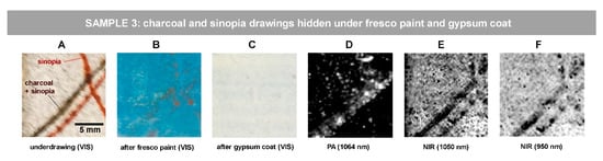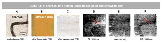 For the abovementioned reason, we simulated stratified Sample 5, where two concealing layers (raw sienna fresco paint and 70-micron thick limewash coat) hide the charcoal traits (Figure 6A–C). Indeed, in such a sample, both PA (Figure 6D) and NIR (Figure 6E,F) imaging are capable of revealing the charcoal sketches. We present here the PA and NIR images processed in equal way by the means of ImageJ, applying 1.0% contrast stretching. The charcoal line edges appear slightly blurred which is probably attributable to the fresco execution method causing the dispersion of black pigment particles, as best revealed by PA image in Figure 6D and by NIR image at 1830 nm in Figure 6F. The best NIR result is observed at 1830 nm (Figure 6F), where limewash is known to show the highest transparency [20].