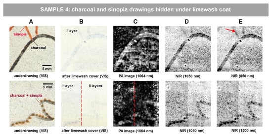 The next step of our research was aimed at revealing the underdrawings under the limewash coat. Such simulation is represented in Sample 4, in which sinopia and charcoal traits are concealed by a 60-microns thick limewash coat (Figure 5A,B top raw) and mixed sinopia/charcoal under a 140 microns limewash (Figure 5A,B bottom raw). Both PA and NIR images were processed in equal way by the means of ImageJ, applying 1.0% contrast stretching and 0.9 gamma correction.