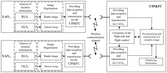 In this block diagram, great importance is attached to a high-speed communication channel, through which the images formed by the equipment of the on-board radar and the OLS are exchanged both among themselves and are transmitted to the CIP&FC of the UAV, since this data batch contains a fairly large amount of information. In addition, the development of a wireless channel for a high-speed multi-position information exchange system must include implementation of masking, compression, and coding algorithms generated by the UAV equipment of images [25,26,27,28,29].