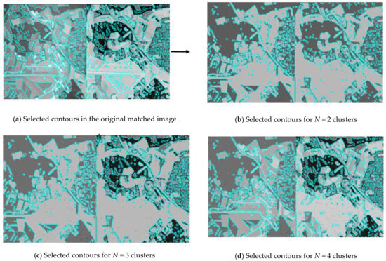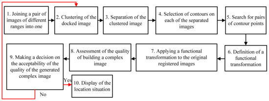 The source location images of the land surface, formed by the onboard equipment of multi-position location systems, are multi-angle and heterogeneous ones (Figure 3a,b). The fusion method includes the operation from joint pre-processing of a pair of original images docked into a single composite image. The pixel clustering algorithm [31] enabled to reduce several gray levels in the image, allowed the selection of some areas while preserving their boundaries. Furthermore, the isolation of borders on the clustered image is done by an appropriate filter.