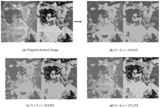 Figure 4 shows part of the sequence of partitions of the original optical and radar images into clusters by the multilevel threshold processing method [31]. In order to isolate similar areas in different images in a similar way, in present research, the technique of joint processing of two images is used. The original docked image is shown in the upper left corner. It is obtained from the original optical image of the land surface converted into grayscale and a color-inverted radar image of the same area. Conversion to grayscale and color inversion enabled to bring identical objects in dissimilar images to the same shades of gray. To the right of the original docked image is a part of the sequence of partitions into clusters. Each partition is labeled with the number of clusters into which all pixels of the original image are divided and contains the value of the standard deviation σ characterizing the quality of the partition. The lower is the value of σ for the same number of clusters, the better is the quality of the partition. It is clearly seen that the same objects are isolated in a similar way already on docked partition into two clusters (N = 2). A further increase in the number of clusters details the internal structure of the caught-on-image objects.