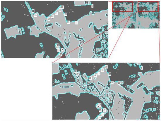 Further, it is necessary to find pairs of contour points on pairs of clustered images with a highlighted border executing block 5 of the method presented in Figure 2. Figure 7 shows enlarged fragments of the same section of the observed zone on a partition with a isolated border after clustering images (Ncl = 2). Pairs of control points similar in relative position to each other on the contour were found on the isolated boundaries [35].