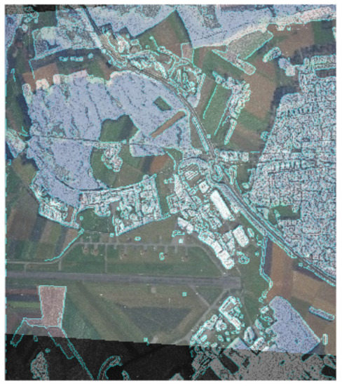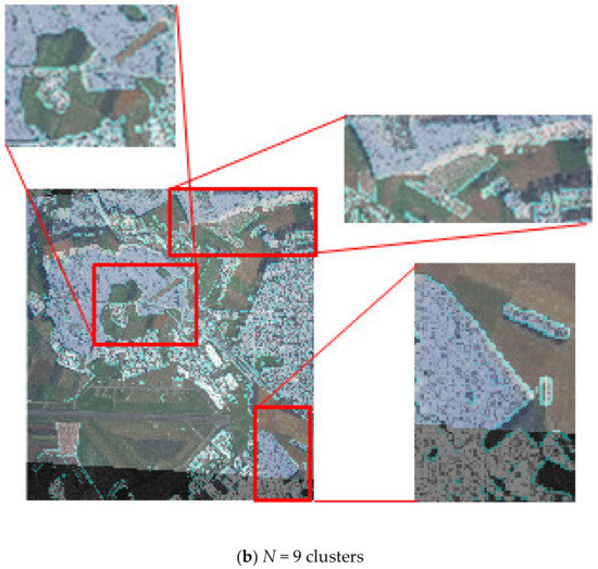 The eighth block of the method (see Figure 2) evaluates the quality of fusion of multi-angle heterogeneous images and makes a decision on the acceptability of the quality of fusion. Figure 8 depict the quality assessment step. The result of Figure 8 can be regarded as unsatisfactory due to the significant discrepancy between the optical and radar layers for Ncl = 3. If the result of the quality assessment is unsatisfactory, you should return to block 2 (see Figure 2) and choose a partition with a large number of clusters. Figure 8b shows a satisfactory result. The layers match almost completely.