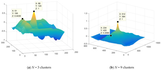 To assess the fusion quality, it is necessary to use the similarity function, which allows assessing the degree of similarity of the contours of the characteristic areas of two different images when establishing a fused image. For this, the calculation of the two-dimensional cross-correlation function [36] of the contours of the clustered images is used. An ideal two-dimensional normalized correlation function is characterized by a single peak of small width at the origin. And outside this peak its values are equal to zero, which is achieved in complete matching of the image contours. Obviously, in practice, the complete matching of the contours of two different images practically cannot satisfy these properties, with the exception of rare cases of combining simple landscapes of the terrain, due to the effect of noise and distortions in the operational modes of onboard sources for generating of location information.