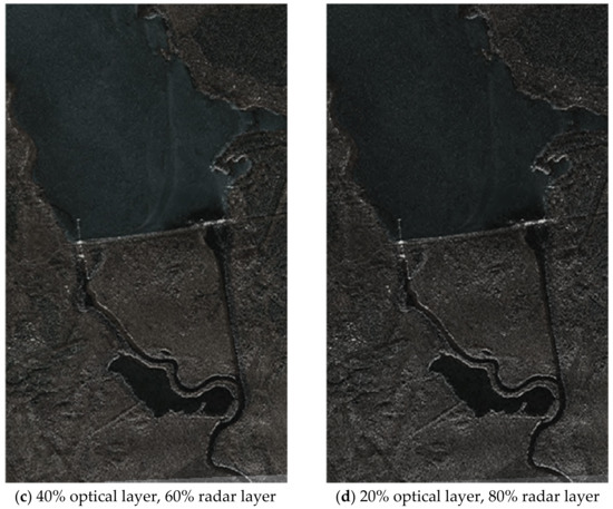 Enhancement of the radar layer over the optical one is shown in the series of images in Figure 13. In this case (Figure 12) the accuracy of fusion of two different-angle images was ±3–4 pixels when passing to the number of clusters Ncl = 5 and reaching the autocorrelation lateral lobe level equal to 0.3156.