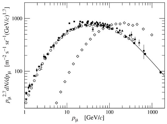 Therefore, using Equation (2), with , and Equation (3), when we consider the entire spectrum of muons at each angle , i.e., for energies GeV and GeV, it is necessary to choose the parameterization that best suits the experimental data.