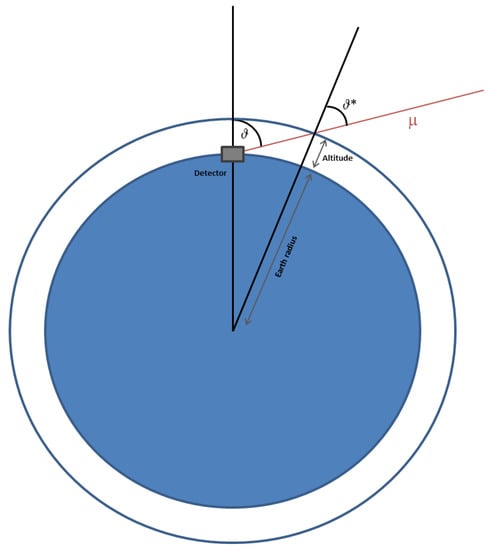 The angles and formed by an incoming muon, respectively, with the normal axis to the earth surface and with the normal axis to the top of the atmosphere.