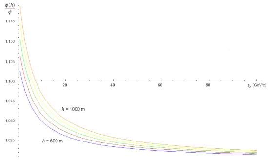 Trends in the ratio between the flux at different altitudes h and the flux at sea level as a function of the muons energy. The comparison of the curves gives the expected percentage change in the flux of muons at different altitudes.
