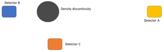 Schematic of the simulated scenario. Detectors (not in scale) placed in the positions A, B and C.