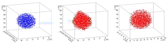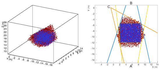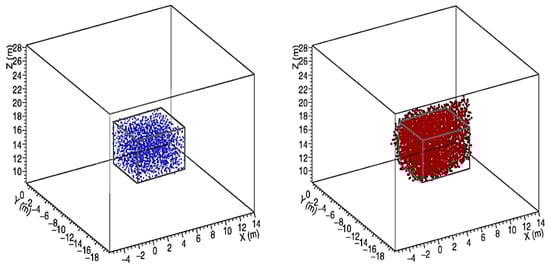 Therefore, the simplest problem we are referring to is to determine the shape and size of the object identified in the target region by having n muographs that see the object from different angles , where , and to have it reconstructed by means of 3D Muography. Given a certain arrangement of n detectors, N simple geometrical objects of different shapes and sizes are simulated, obtaining the dataset , where . Using the same arrangement of detectors as in Figure 4, so that , we produce the set of muographs obtained by a cloud of points randomly distributed in a cubic volume, which represents the unknown object x. The algorithm will predict that the shape and size of the muographed object are compatible with a 6 m side cube X, as in Figure 6. On the other hand, the same set of muographs is used to 3D reconstruct the unknown object r.