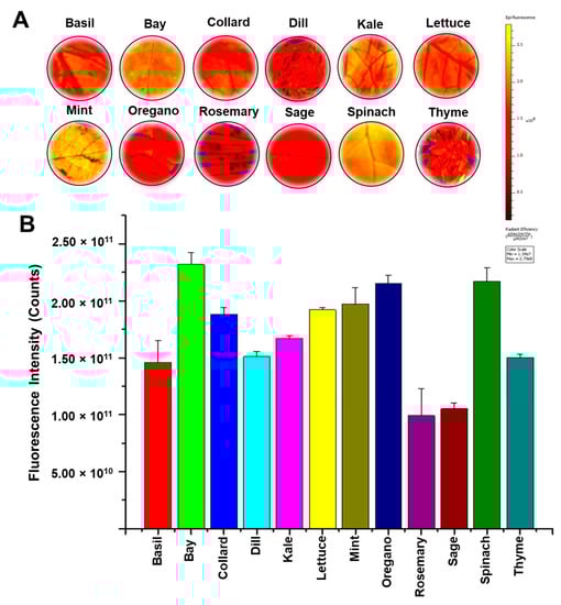 Initially, we began screening the NIR fluorescence properties of the twelve different dietary leaves using an IVIS Imaging System. Representative images of dietary leaves were imaged in their original form for chlorophyll fluorescence (Figure 1A). The color scale was set to maroon to yellow (low to high fluorescence counts) in the image analysis. The visual observation suggested that bay leaf, collard, lettuce, mint, oregano, and spinach leaves exhibited higher fluorescence compared to the other group of leaves (basil, dill, kale, rosemary, sage, and thyme). The fluorescence signal intensity was measured using software on the leaves (ROI) in photons per second per square centimeter per steradian (p/s·cm2·sr) (Figure 1B).