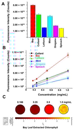 To identify a superior fluorescence property from the origins of Chl, the leaf extract was processed for fluorescence measurements. These whole leaf extracts (5 µL drop) were placed on Whatman filter paper and imaged for fluorescence. The physical appearance of NIR fluorescence and their respective counts are presented in Figure 2A,B. Results indicated that bay leaf showed the highest fluorescence intensity. This phenomenon was true at all concentrations (0.166 to 1.0 mg extract/mL) (Figure 2B,C). There was obvious evidence that bay leaf exhibited the highest fluorescence intensity, and the order was bay leaf > collard > mint >oregano > lettuce > spinach. It is important to note that spinach as a whole leaf provided significant fluorescence but not as a leaf extract (Figure 2A). This may be due to the lower amount of Chl during the extraction process. However, it is consistent that bay leaf produced higher NIR fluorescence characteristics.