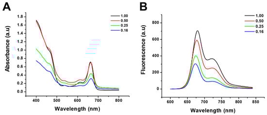 Optical properties of bay leaf extracts (concentration: 0.16–1.0 mg/mL). (A) Visible absorption spectra of bay leaf (400–800 nm) and (B) fluorescence spectra of bay leaf, excitation: λex, 405 nm and emission: λem, 600–850 nm. Data are representative of a triplicate reading.
