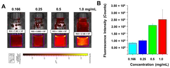 To test the fluorescence property of bay leaf Chl extraction in a tissue-like environment, a 2.5% agarose solution (agar phantom) was used. The agar phantoms were prepared with dilutions of bay leaf extracted Chl. Each dilution was imaged under the excitation and emission of 600/710 nm with the IVIS Imaging System. The representative fluorescence images of agar phantoms with 0.166–1 mg extract/mL are presented in Figure 4A. Based on the results, it is evident that the fluorescence detection was concentration- dependent. The agar phantoms demonstrated the highest computed fluorescence profiles for 1.0 mg/mL samples, whereas the 0.166 mg/mL concentration exhibited the lowest (Figure 4A,B).