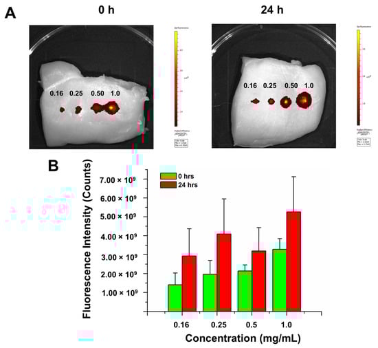 To evaluate the tissue bioimaging capability of bay leaf extracts, an ex vivo imaging method was utilized. The bay leaf extracts of different concentrations (0.166–1.0 mg/mL) were placed on chicken tissue and fluorescence images were acquired. It is evident from Figure 5 that the bay leaf extracts exhibited a dose-dependent fluorescence imaging capability. This behavior was continued even at 24 h. These data demonstrate that bay leaf extract could act as an excellent imaging agent for improved contrast purposes in non-invasive tissue imaging applications.