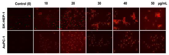 The uptake of fluorescence probe is necessary for enhancing imaging capabilities. To examine the uptake of the bay leaf extract in cancer cells, two different cancer cell lines, SK-HEP-1 (liver cancer) and AsPC-1 (pancreatic cancer), were used. Both cell lines were exposed to different concentrations of bay leaf extract (10–50 µg/mL) for an hour and imaged with a fluorescent microscope. The results from this experiment demonstrated a concentration-dependent uptake of bay leaf extract in both cell lines; however, more significant uptake was observed in SK-HEP-1 cells than in AsPC-1 cells (Figure 6).
