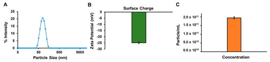 Characterization of bay leaf chlorophyll extract. Dynamic light scattering (DLS) was used to characterize Chl extracts. (A) Average particle size for bay leaf extracted Chl was 62.72 nm. X-axis scale was set as log. (B) Surface charge was recorded as −24.76 mV. (C) Particle concentration per mL was 1.95 × 1011. Data represent the average of three different experiments.