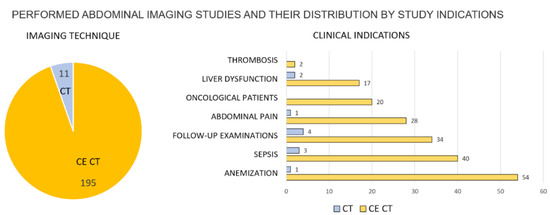 Left: Contrast Enhanced Computed Tomography—CE CT (and CTs) are 94.7% (5.3%) of all the acquired CTs. Right: study indications for each imaging modality show that anemization is the study indication for which most CE CTs were acquired, while CTs were mostly used for follow-ups. Sixteen patients were found to have pulmonary embolism at chest CT performed before or during abdominal examinations. Embolism was not associated with any abdominal finding (p > 0.05).