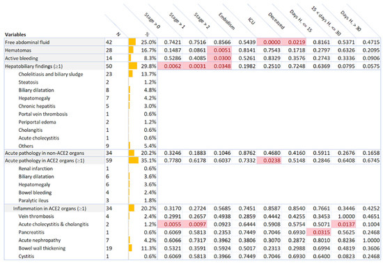 Abdominal imaging findings and related p-values are summarized in Figure 2. In order to improve the reproducibility of the study, their definition is reported in Appendix A.