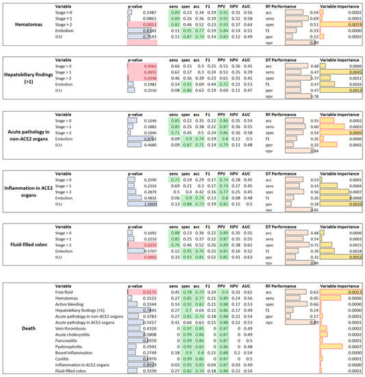 The only acceptable results (accuracy greater than 0.5 with a balance between sensitivity and specificity) suggesting the existence of weak relationships were obtained for hematomas, dependent only on COVID-19 stage > 2; hepatobiliary findings, dependent on COVD-19 stage > 2; acute pathology in non-ACE2 organs, dependent on all COVID-19 stages in decreased order of severity; inflammations in ACE2 organs, which depended on ICU, embolism and COVID-19 stages in decreasing order of severity; and fluid-filled colon, which depended on admission to ICU and COVID-19 stage > 2.