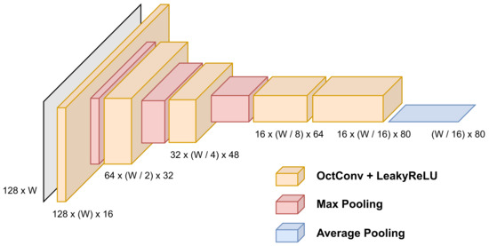 The proposed Octave-CNN architecture, as shown in Figure 1, is aimed at the extraction of features from the input image in a feed-forward manner. It consists of five convolutional blocks, each one containing an OctConv layer with kernel size pixels, stride equal to 1 and batch normalization [21]. The leaky rectified linear (LeakyReLU) [22] function is used for neuron activation, which provides a small gradient value when the unit is not active. A maximum pooling layer with kernel size equal to is used after the first three blocks, to reduce the spatial dimensions of the features. Additionally, a dropout layer, with probability equal to (experimentally defined) is included in the last three blocks, to assist for better generalization ability and robustness of the features [23]. The combination of batch normalization and dropout achieved best performance during our experimentation, which coincides with the findings of several state-of-the-art works [2,4,14]. Finally, the average of each column of the feature maps of the last layer is calculated, to acquire a feature vector with 80 features for each time step along the width of the image, as shown in Figure 3.