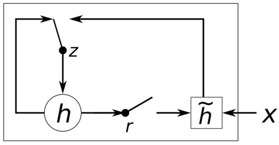 The gated recurrent unit (GRU) [8] is a recurrent network architecture that comprises two gates, namely the reset gate r and the update gate z, as shown in Figure 4. For each recurrent unit j at time-step t, the current input and the activation of the previous time-step are used to compute both gates as follows: