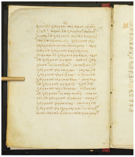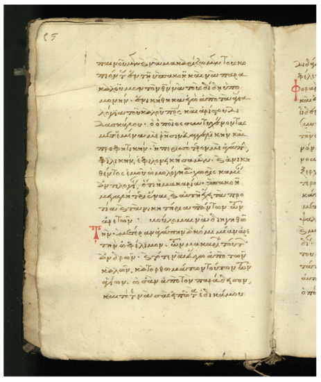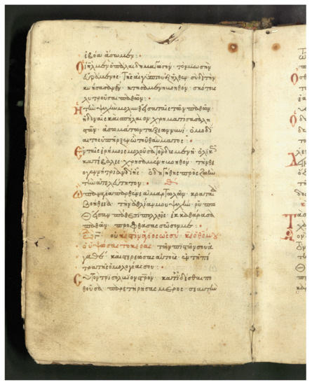 The collection is one of the oldest Stavronikita Monastery on Mount Athos. It is a parchment four-gospel manuscript which has been written between 1301 and 1350. It comprises 54 pages with dimensions that are approximately 250 × 185 mm. The script is elegant minuscule and the use of majuscule letters is rare. Tachygraphical symbols and abbreviations are encountered in the manuscript as well. Furthermore, the manuscript is enriched with chrysography, elegant epititles and initials. The dataset of 53 consists of 1038 text lines, containing 5592 words (2374 unique words) distributed over 54 scanned handwritten text pages. An example page is shown in Figure 5, and the collection is publicly available for research purposes [25].