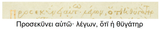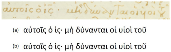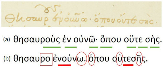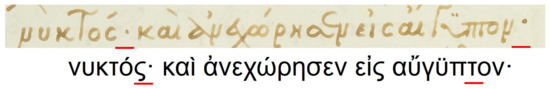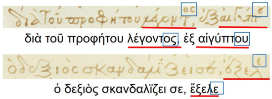 Figure 9. ‘Minuscule’ writing example. Key locations in the text line that correspond to this particularity are underlined. - Polytonic orthography: The polytonic system is common in all Byzantine manuscripts, as illustrated in the example document images shown in s Figure 5, Figure 6 and Figure 7. A particularity of this polytonic system are the characters greek ϊ and greek ϋ, which were used in this form to be distinguished from the diphthong letters, as shown in Figure 10. The problem with these characters concerns their transcription, which is not unique but it relies upon the context. In particular, either the character is transcribed as shown or transcribed as a character without the specific diacritic marks (diaeresis).